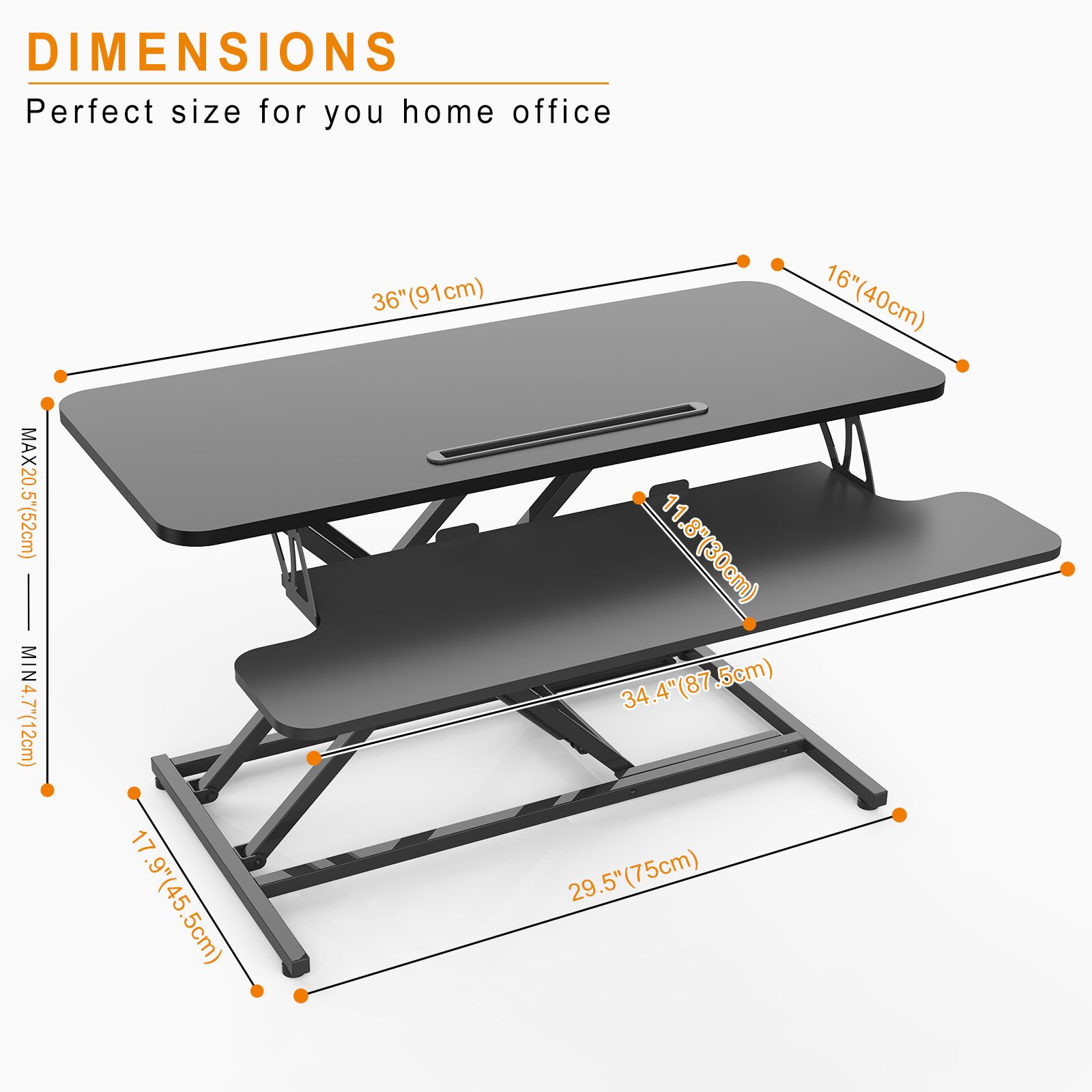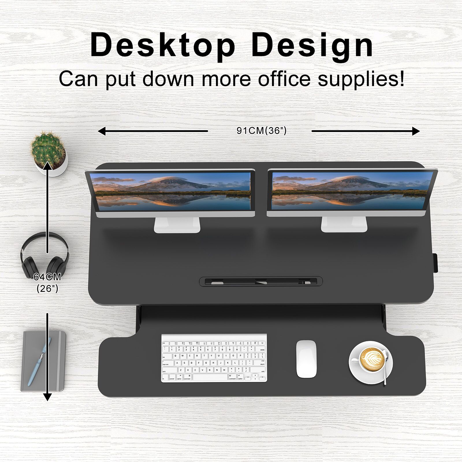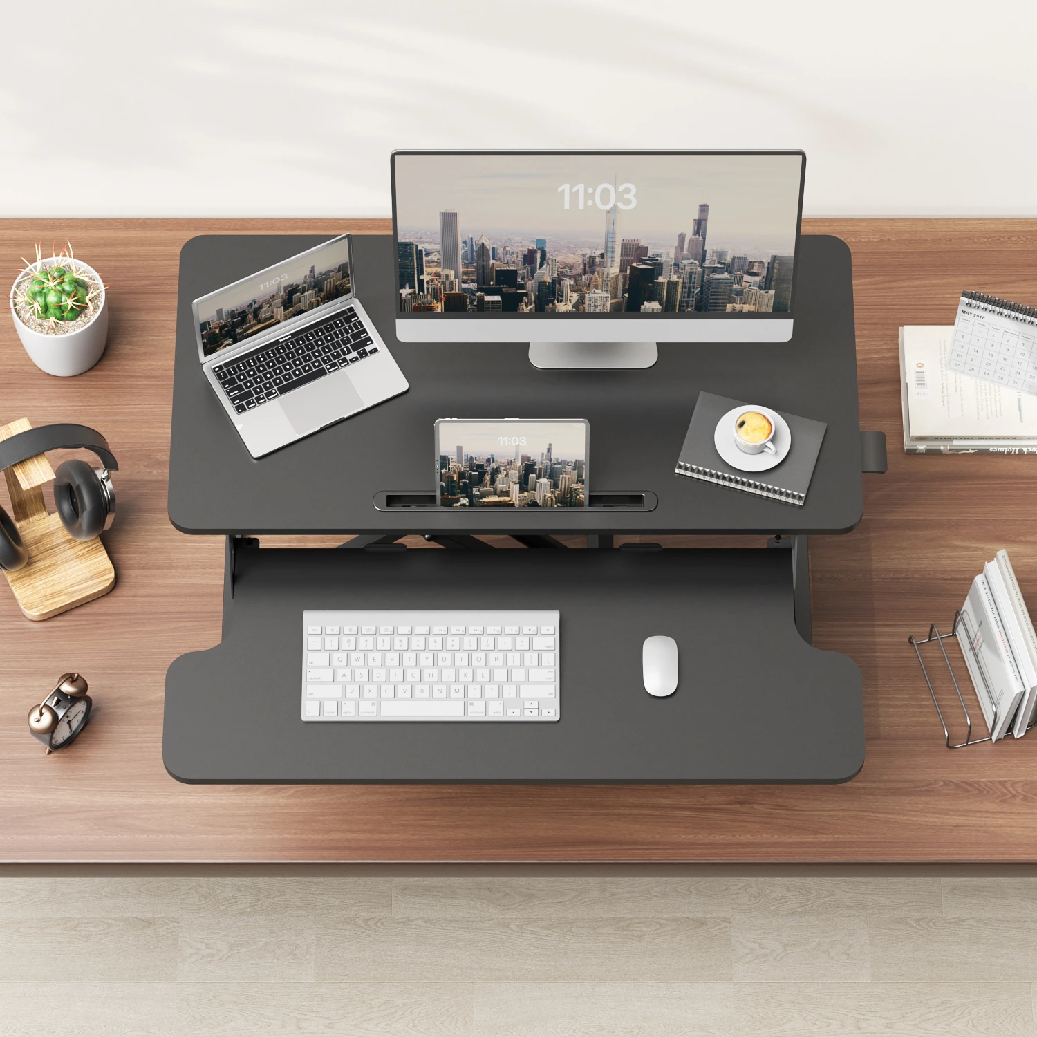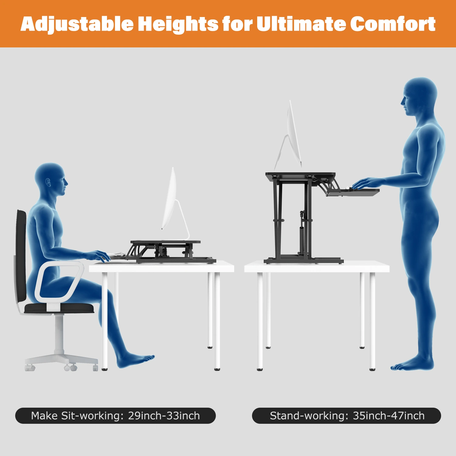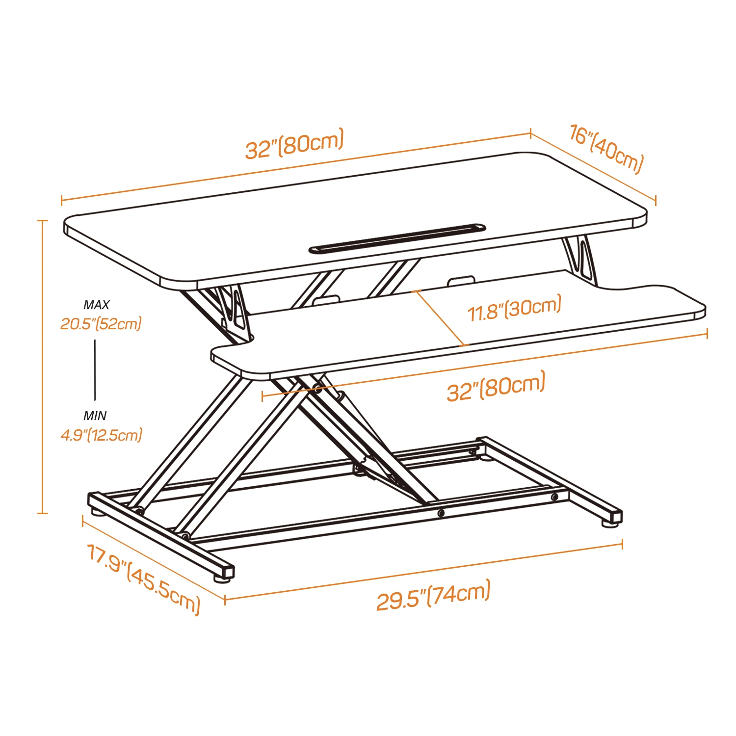 This desk converter is ingeniously crafted to provide you with more space and enhance your work efficiency. The upper tier, boasting a solid 15kg (33lbs) capacity, spans 80 x 40cm (32″ x 16″), offering ample room for single or dual monitor setups, or a laptop, adapting to various work preferences. The lower tier, with a 2kg (4.4lbs) capacity and dimensions of 80 x 30cm (32″ x 12″), comfortably fits a standard keyboard, mouse, and other office necessities like calculators or paperwork. This smart, tiered arrangement not only tidies up your workspace but also ensures all your tools are conveniently at hand, boosting productivity and comfort.”