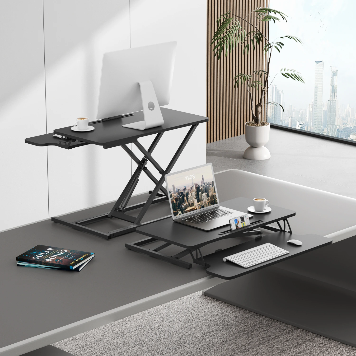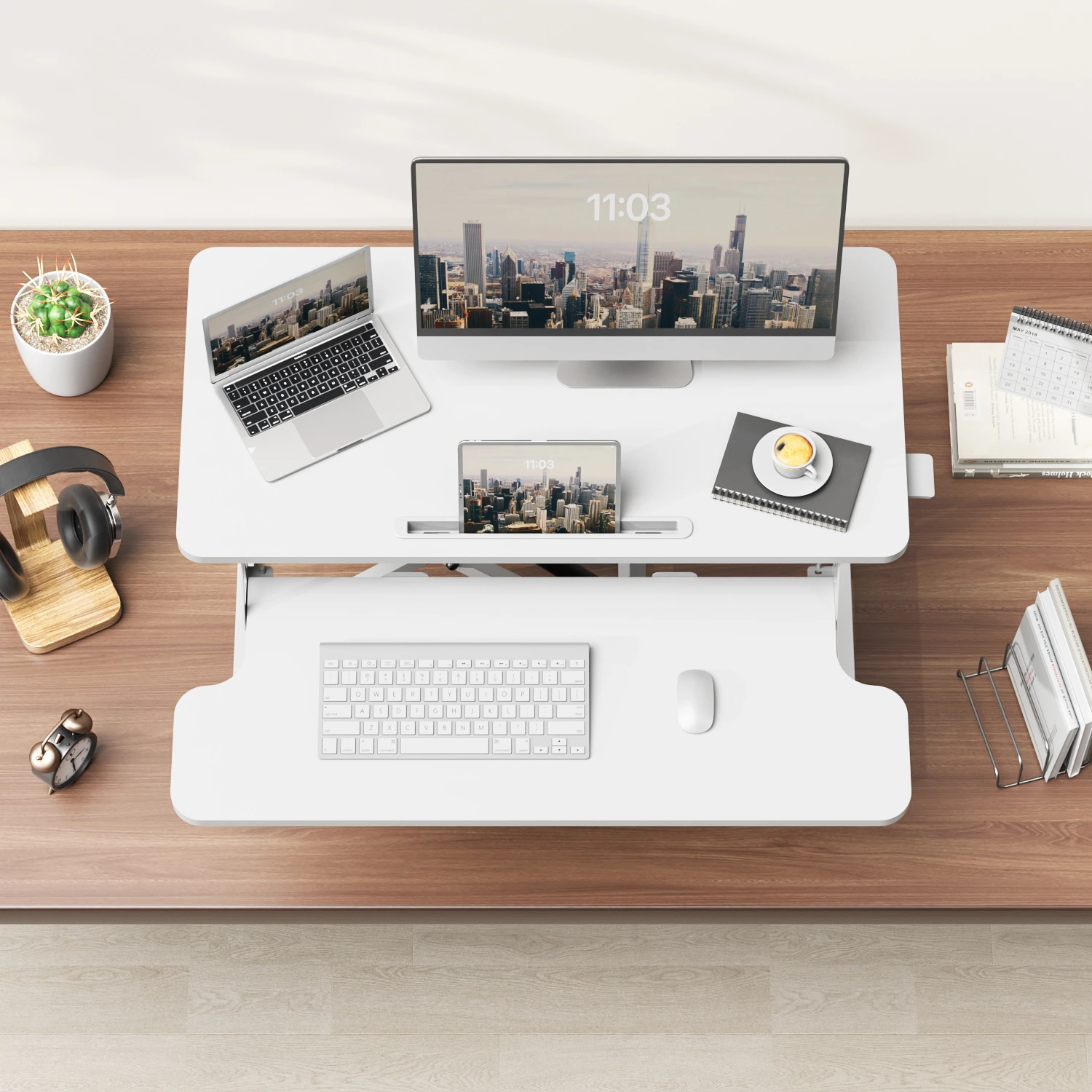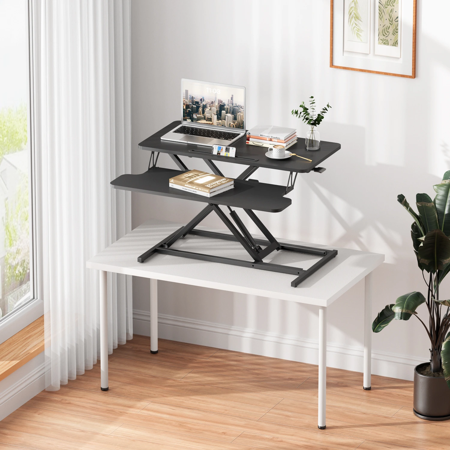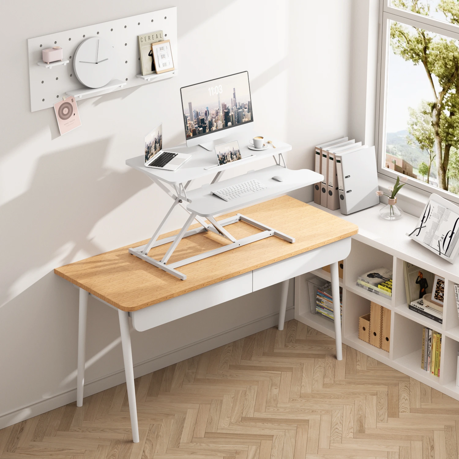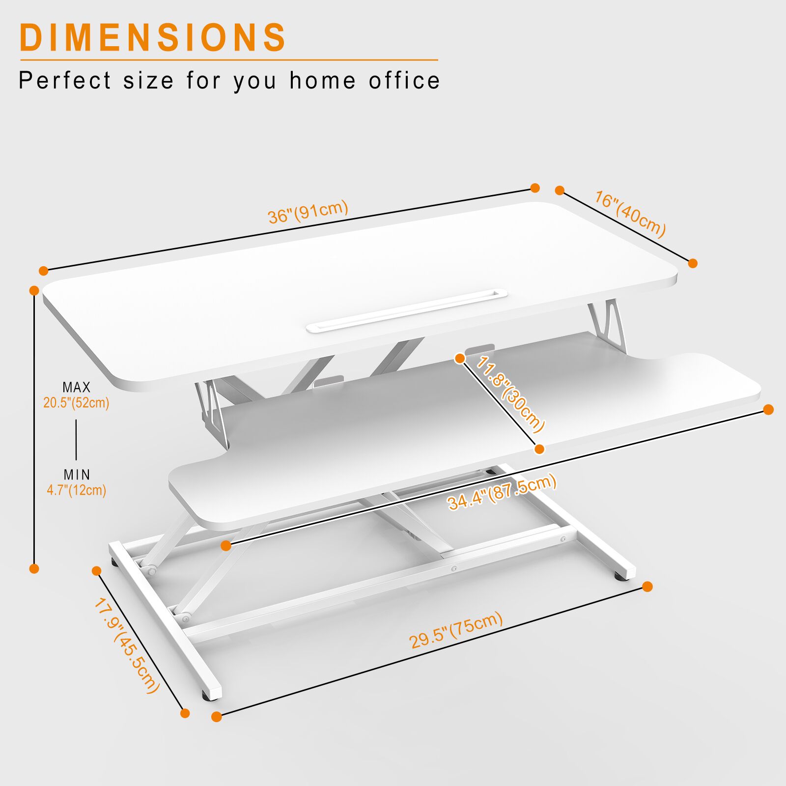 This desk converter is ingeniously crafted to provide you with more space and enhance your work efficiency. The upper tier, boasting a solid 15kg (33lbs) capacity, spans 80 x 40cm (32″ x 16″), offering ample room for single or dual monitor setups, or a laptop, adapting to various work preferences. The lower tier, with a 2kg (4.4lbs) capacity and dimensions of 80 x 30cm (32″ x 12″), comfortably fits a standard keyboard, mouse, and other office necessities like calculators or paperwork. This smart, tiered arrangement not only tidies up your workspace but also ensures all your tools are conveniently at hand, boosting productivity and comfort.”